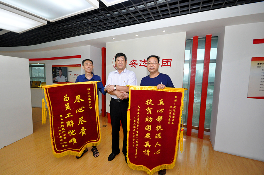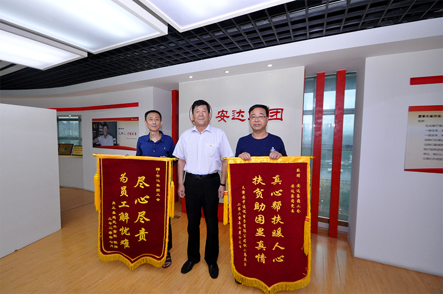 8月24日,鸿达精工机械有限公司职工桑建民、安中通讯电子有限公司职工高庆玉,作为困难职工代表来到广发官方网站-集团,分别将绣有“真心帮扶暖人心,扶贫助困显真情”,“尽心尽责,为员工解忧难”的锦旗送到了广发官方网站-集团党委书记、董事长崔洪金,工会主席郑宝彦的手中,感谢广发官方网站-党委、工会对他们的真心关怀和帮助。