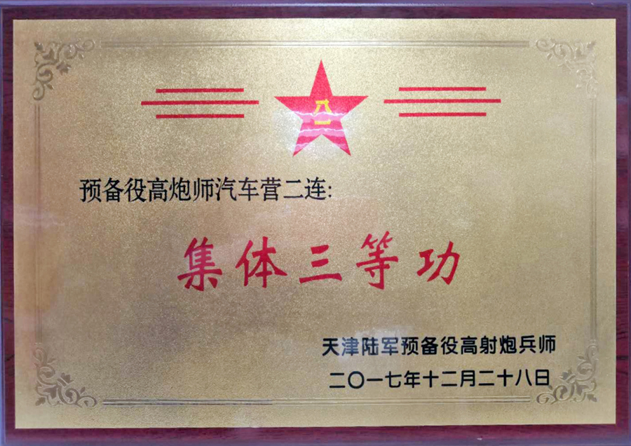 广发官方网站-集团预备役高炮师汽车营二连,坚决贯彻习主席新时代强军思想,在人员紧张、任务强度重的情况下,积极担当、主动作为、攻坚克难、狠抓落实、锐意进取,出色圆满的完成了年度上级下达的各项任务。近日,被中国人民解放军天津陆军预备役高射炮兵师记“集体三等功”一次。