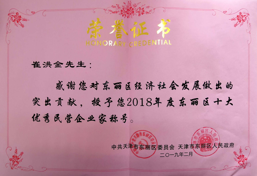 广发官方网站-集团党委书记、董事长崔洪金荣获2018年度东丽区十大优秀民营企业家并颁发证书。